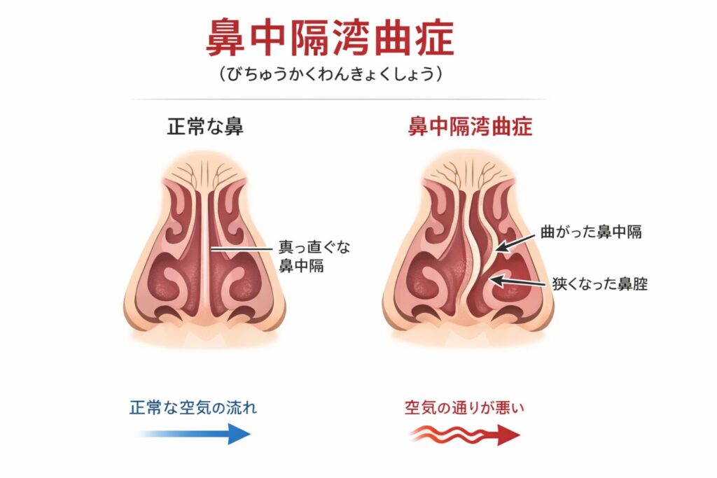 鼻中隔湾曲症と言うのは、鼻の中の鼻中隔が曲がっており、気道を塞いでしまう状態です。